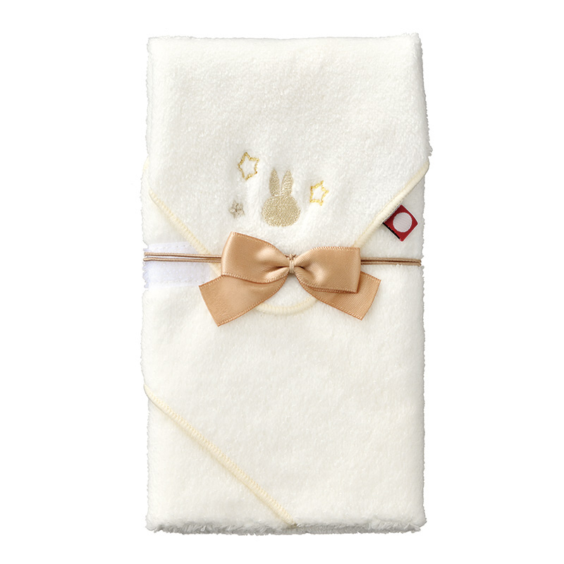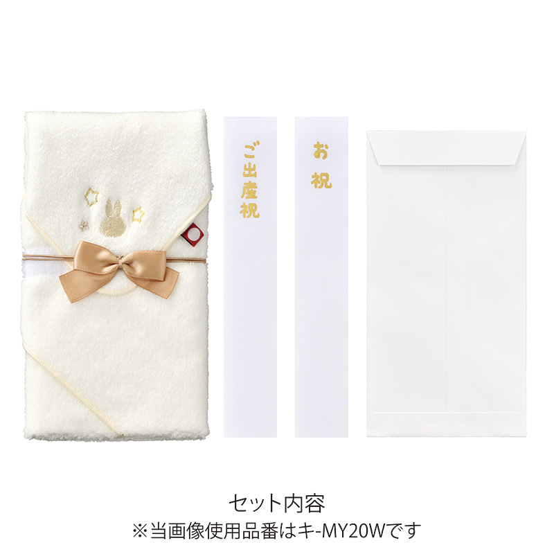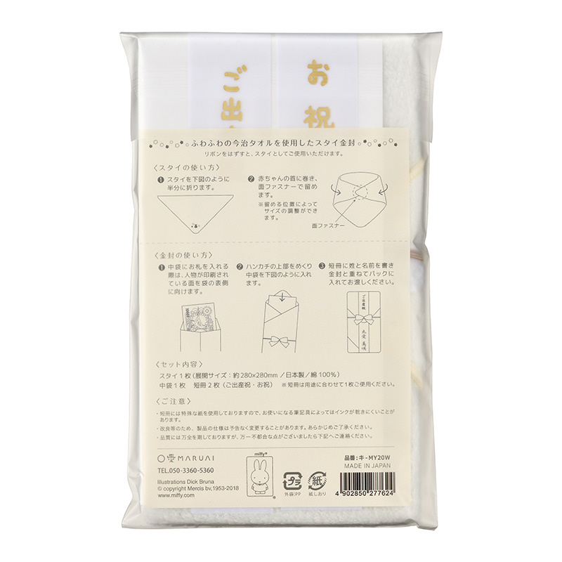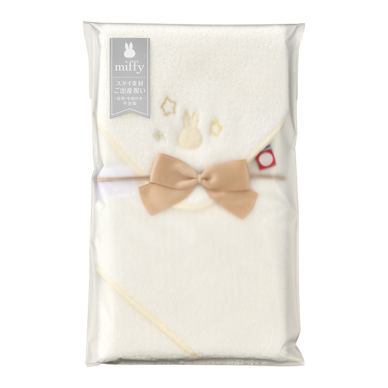 ミッフィーの祝儀シリーズに、今治タオル製のスタイを使用した出産祝に最適な金封が仲間入りしました。ふわふわした柔らかな肌触りが心地よく、お祝いを包んで贈った後もスタイ(よだれかけ)として使っていただけます。ギフト感覚で使っていただきたい祝儀袋です。金封サイズ: W100×H180mm、スタイ展開サイズ: W280×H280mm。セット内容: スタイ1枚、中袋1枚、短冊2枚(ご出産祝、お祝)入。