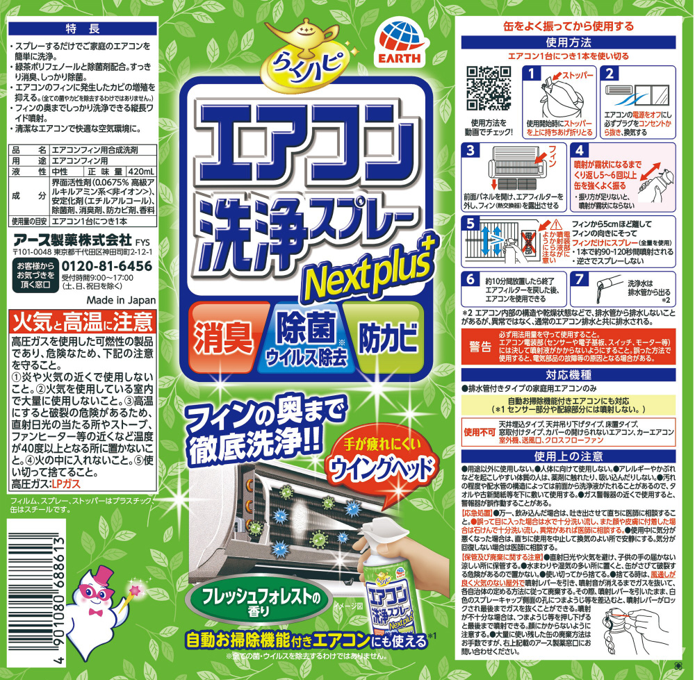 | 商品名 | らくハピ エアコン洗浄スプレー Nextplus フレッシュフォレスト (420mlx2) 〔電化製品用洗剤〕 |