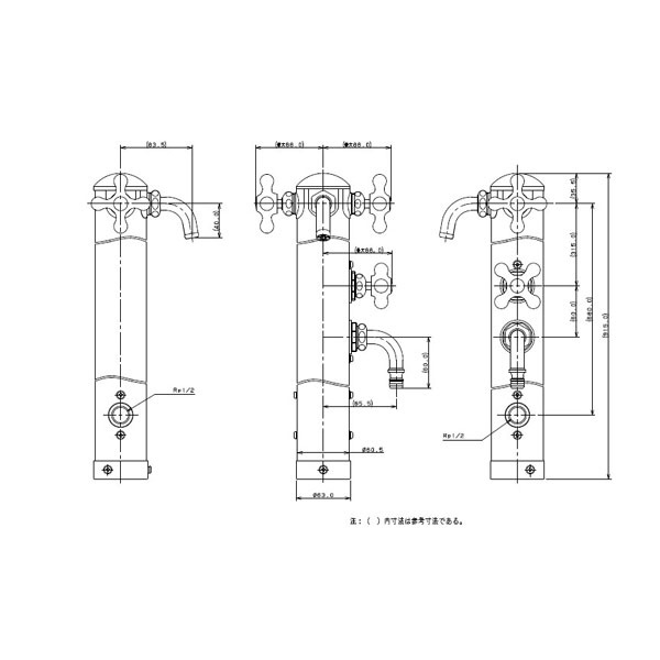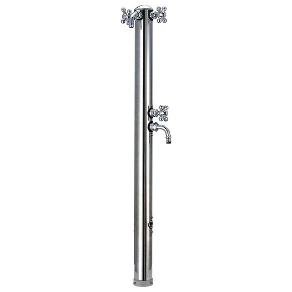 ●上段: 湯水混合、本体横: 水専用554-503ホースドラムなどに接続すると水やりに最適、固定コマ仕様、鏡面仕上げ。