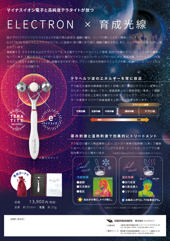 テラタイトRボールは瞬温、瞬冷効果により毛穴ケアができ、マイナスイオンコーティングボール(モナザイト配合特殊ホワイトコーティング)は美肌効果が期待できます。また、育成光線を放出し、細胞の代謝を活性することが期待できます。