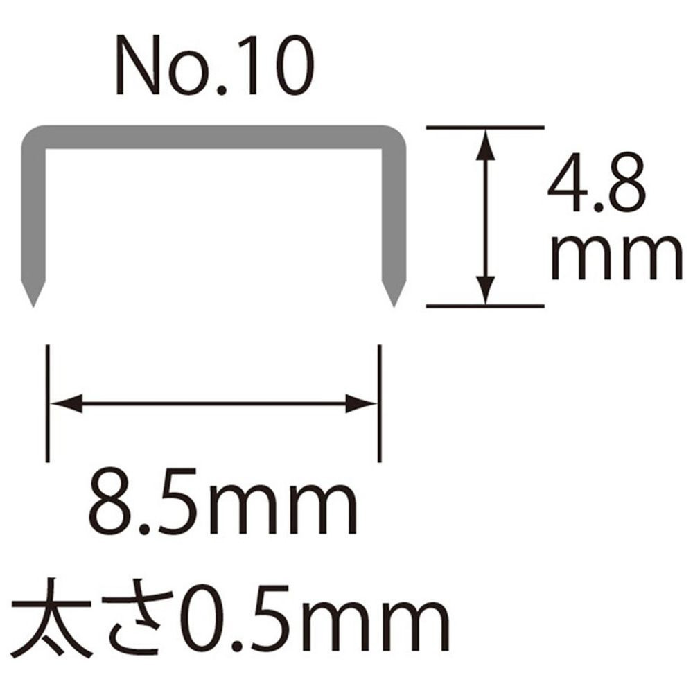 ・ホッチキス針「No.10」は、最も一般的なホッチキス、ハンディタイプに使用されるサイズのホッチキス針です。幅8.5mm、高さ4.8mm、太さは0.5mmです。とじ枚数は2〜20枚用。当社のホッチキス「フラットかるヒットST−010VN/ST−010VNH」、「ピタヒットST−010X/ST−010XH」、「かるヒットST−010A/ST−010AH」、「ラクヒットST−010R/ST−010RH」でご使用いただけます。