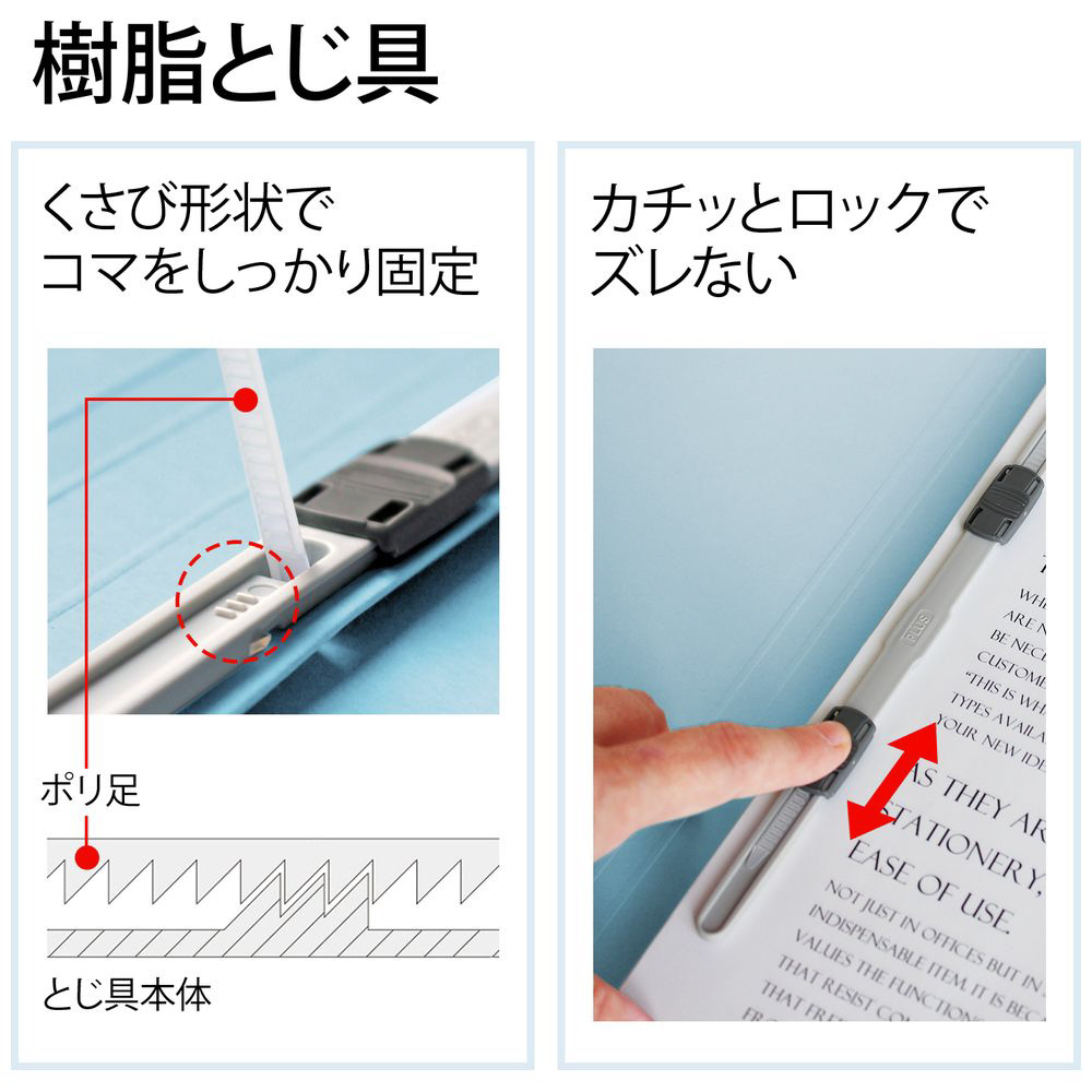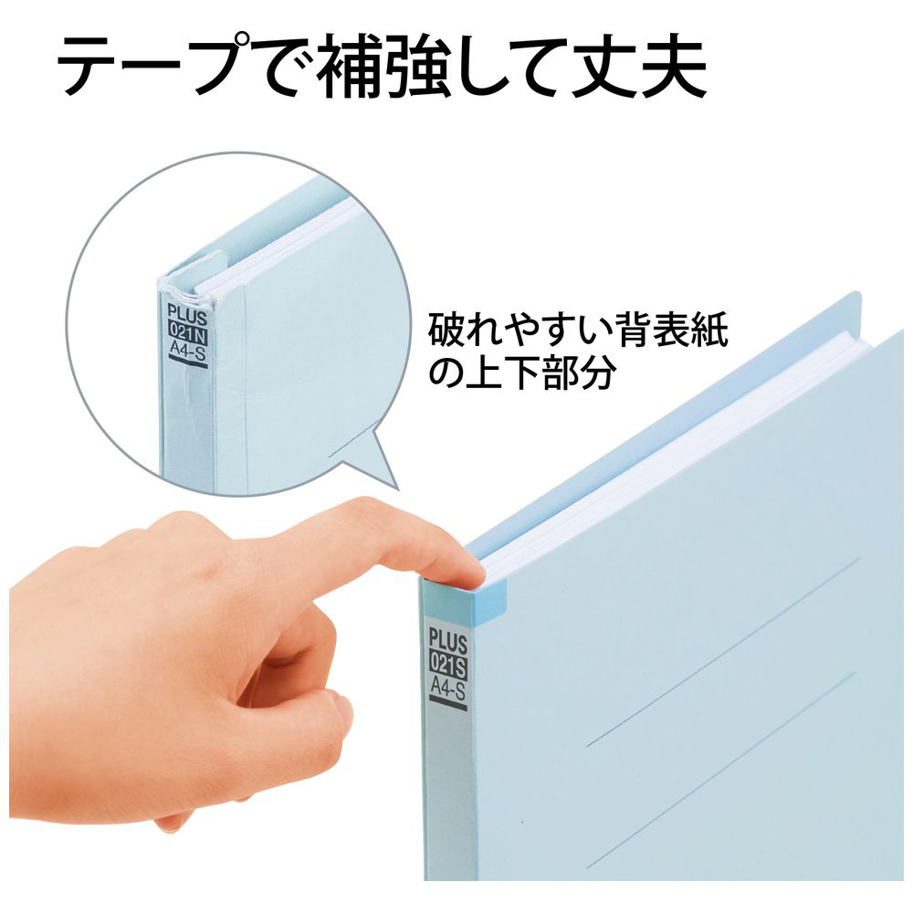 ・地球環境にやさしい、カラフルでスリムなフラットファイルの背補強タイプ。・棚や書庫からファイルを出し入れする際、背表紙の上部に指をかけてとることが多いオフィスの環境でも、背表紙上部を補強してあるので傷みにくいタイプです。・破れやすい背表紙の上下部分をテープで補強しているので、くり返し指をかけてもボロボロになりにくいです。頻繁に取り出す書類の保管におすすめです。・「ノンステッチ」なので、とじ具を外すだけ、簡単・分別廃棄!表紙とじしろ部の金属ステッチをなくした、のりによる接着式です。針の取り外しがいらない簡単分別で、背表紙の浮きもなく、すっきりと収納できます。・丈夫で使いやすい、しかもエコ。強度のある古紙パルプ配合の再生紙を使用。丈夫で使いやすさも抜群です。・100%再生樹脂とじ具を使用。100%再生ポリプロピレン(PP)製薄型とじ具を採用。クリーン焼却できる素材です。・ズレることなくしっかりファイル。とじ具に3つ山ストッパーを採用し、背幅に応じて書類をしっかり保持します。