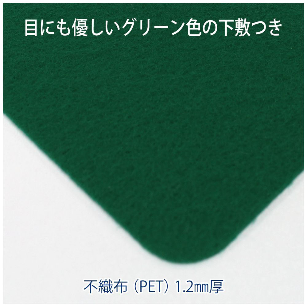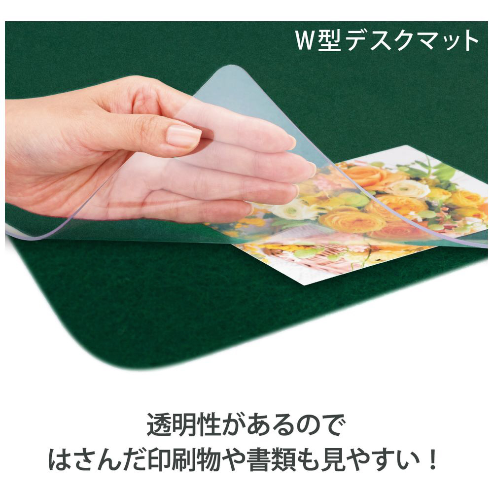 ・傷や汚れから机を守る、デスクマット!・コストを追求したシンプルなデスクマット。・グリーン色の下敷付きです。(Wタイプ)・筆記用保護マットのシンプルな仕様なので、オフィスや家庭など色々なシーンで使いやすいタイプ。・マット表面は光沢タイプです。・目に優しいグリーン色の下敷付きで、はさんだ書類などが見やすく、上のマットもずれにくいから作業がしやすいです。・マット厚:1.2mm 、下敷厚:1.2mm・※ 上部マットと下敷は接合せず、別々です。・※デスクマットは素材の特性(縮みやすい材質)により、寸法に若干の誤差が生じます。