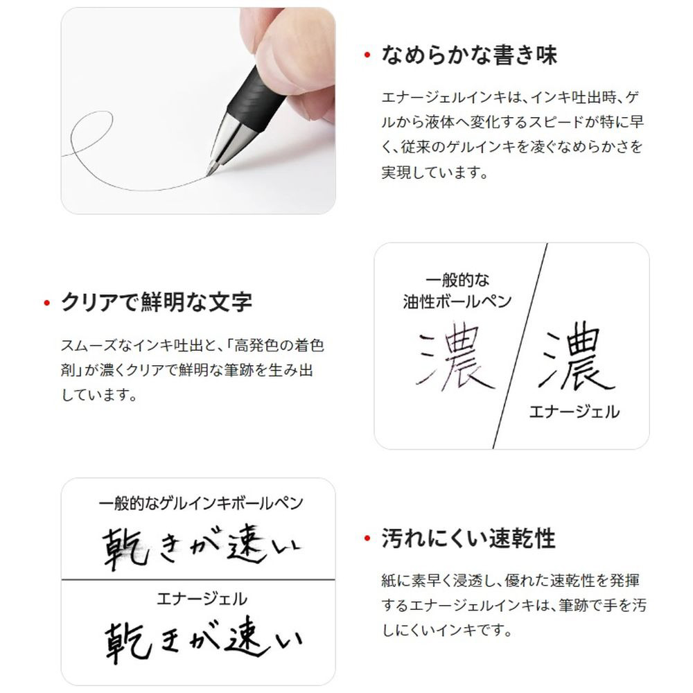 エナージェルインキ採用。軽くなめらかな書き味。濃くはっきりとした文字が書け、速記にも強く、乾きも速い。