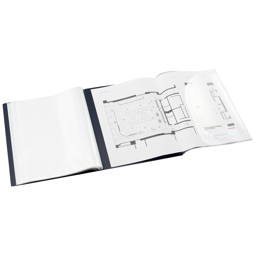 裏表紙には見開きオープンポケット付き。A3用紙も見開きで確認できます。クリヤーポケットの間に挟めばしおりになります。書類の量に合わせて背幅が広がるダブルヒンジ加工。
