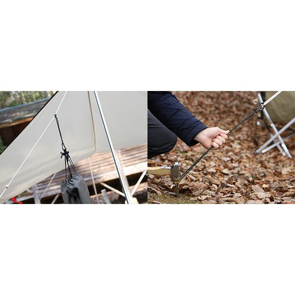 ●テント・タープの収納袋をなくさないように吊るして整理したり、テントのペグ打ちにも使える