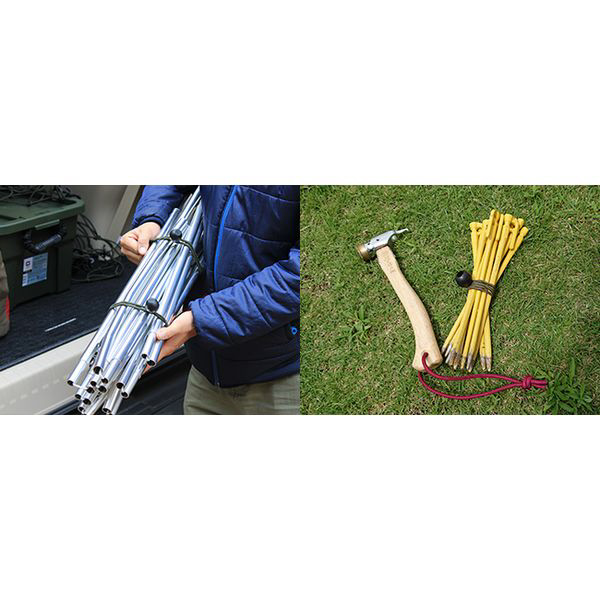●テントのポールやベグ等、棒状のツールをまとめて整理するのに便利