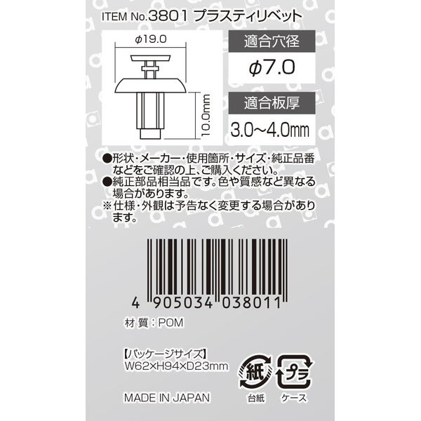 商品名 3801 プラスティリベット (トヨタ車用) グリル用/5個入り 3801