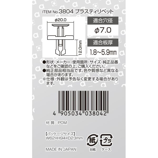 | 商品名 | 3804 プラスティリベット (トヨタ車用) フロントアンダーカバー用/5個入り 3804 |