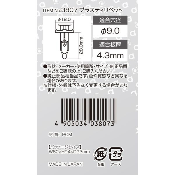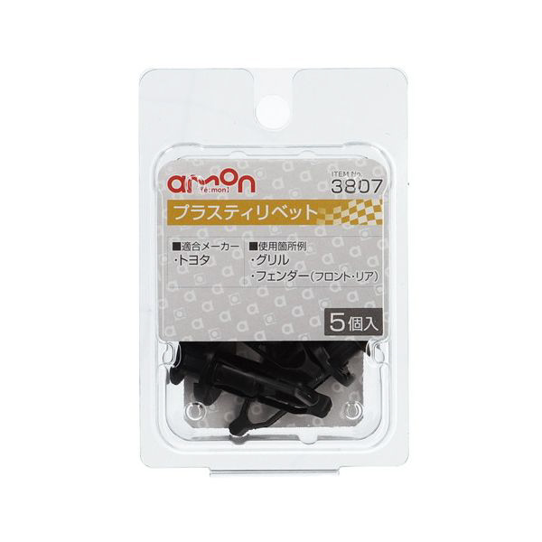 | 商品名 | 3807 プラスティリベット (トヨタ車用) グリル・フェンダー(フロント/リア)用/5個入り 3807 |
