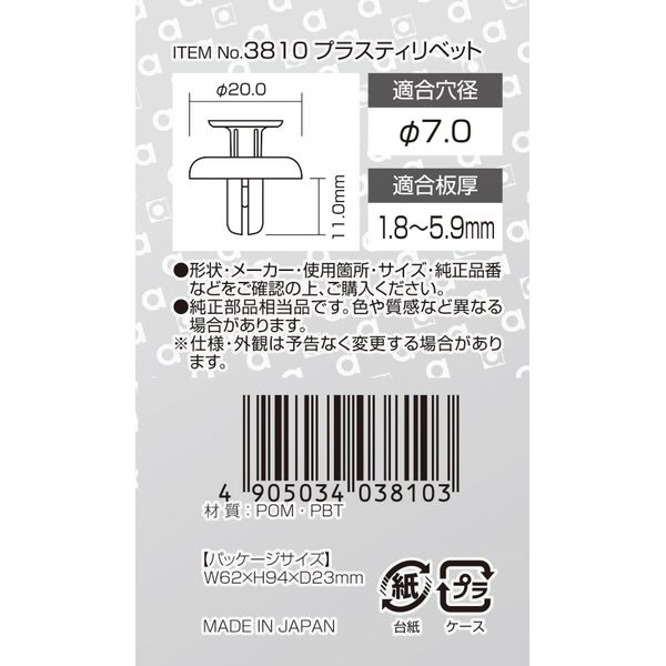| 商品名 | 3810 プラスティリベット (トヨタ車用) タイヤハウス・トランクトリムなどに/5個入り 3810 |