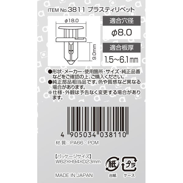 | 商品名 | 3811 プラスティリベット (日産車用) グリル・リアフェンダー用/5個入り 3811 |