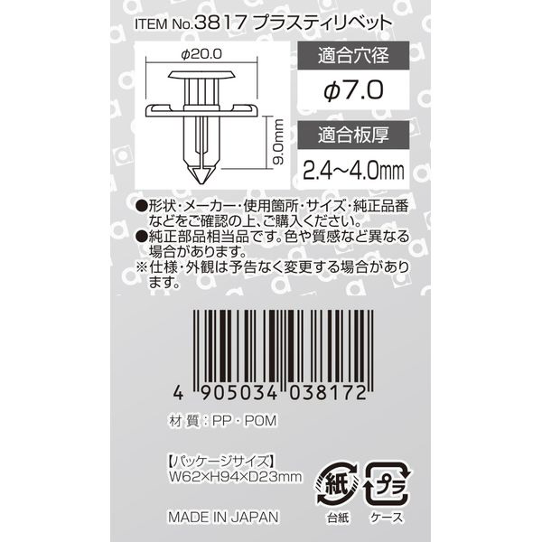 | 商品名 | 3817 プラスティリベット (三菱車用) センターピラー・インナーフェンダー用/5個入り 3817 |