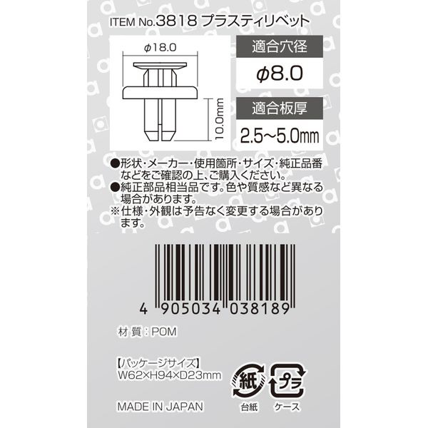 | 商品名 | 3818 プラスティリベット (スバル車用) フロントフェンダー・フロントグリル用/5個入り 3818 |