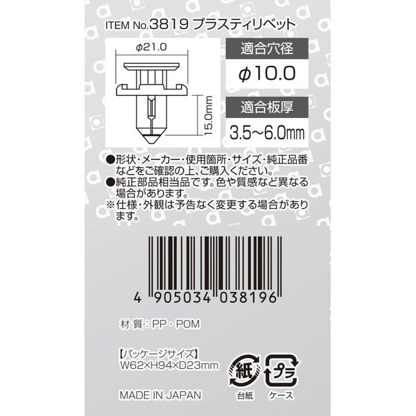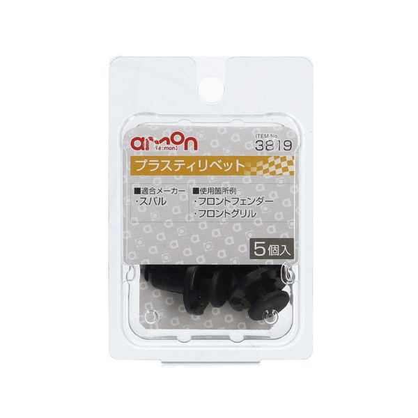| 商品名 | 3819 プラスティリベット (スバル車用) フロントフェンダー・フロントグリル用/5個入り 3819 |