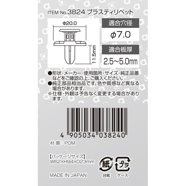 | 商品名 | 3824 プラスティリベット (スズキ車用) タイヤハウス・バックドアトリムなどに/5個入り 3824 |