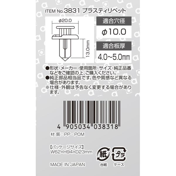 | 商品名 | 3831 プラスティリベット (ホンダ・ダイハツ車用) タイヤハウス用/5個入り 3831 |