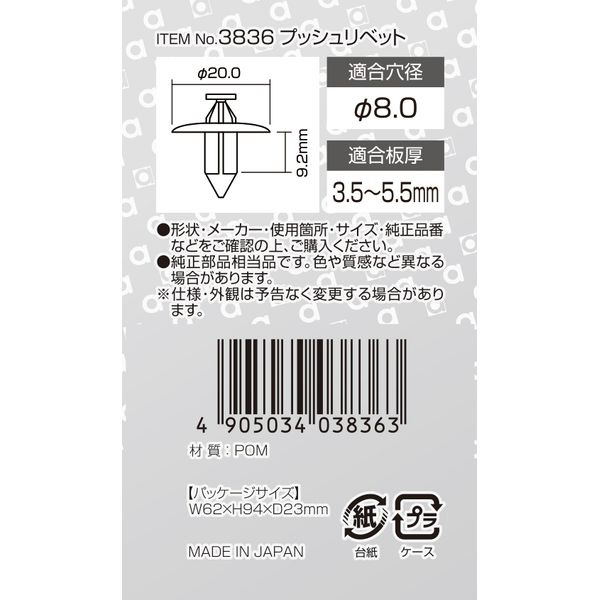 | 商品名 | 3836 プッシュリベット (日産車用) フェンダープロテクター用/5個入り 3836 【864】 |