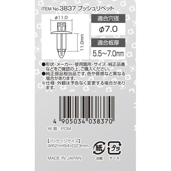 | 商品名 | 3837 プッシュリベット (マツダ車用) フロントグリル用/5個入り 3837 |