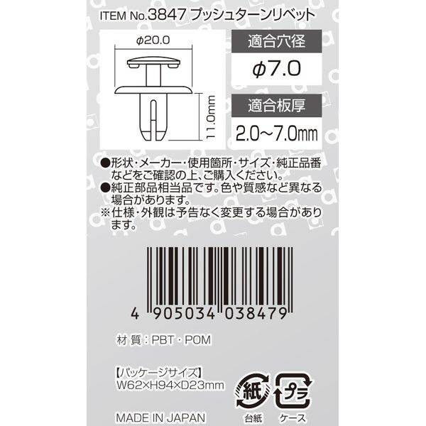 商品名 3847 プッシュターンリベット (スバル車用) フロントフェンダー用/5個入り 3847