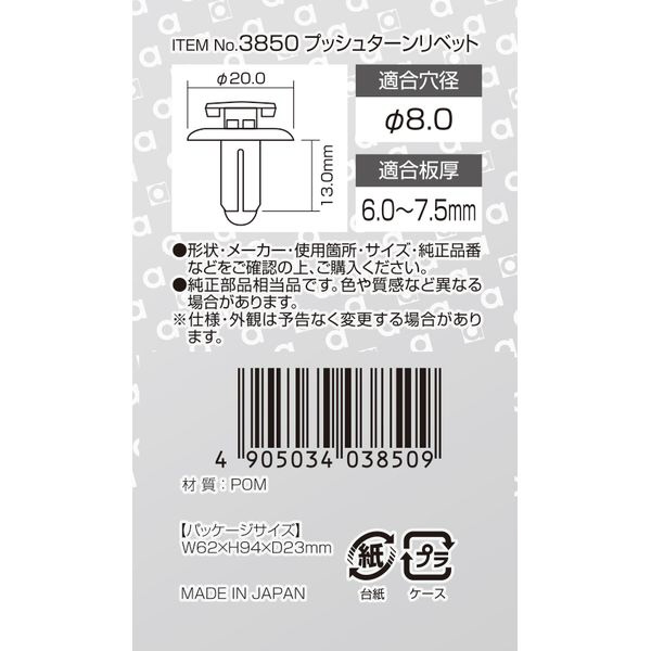 | 商品名 | 3850 プッシュターンリベット (日産・スバル車用) センターピラー・インナーフェンダー用/5個入り 3850 |