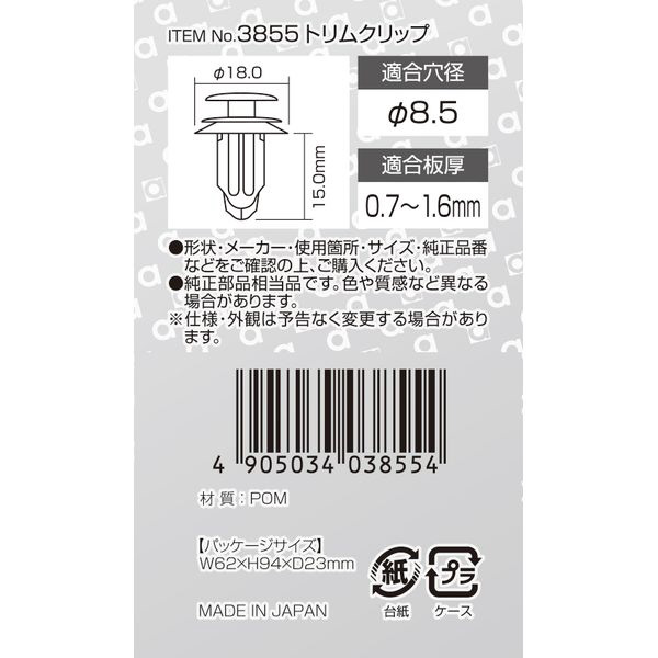 | 商品名 | 3855 トリムクリップ (トヨタ車用) トリム(サイド/バックドア/トランクルーム)・ピラー用/5個入り 3855 |