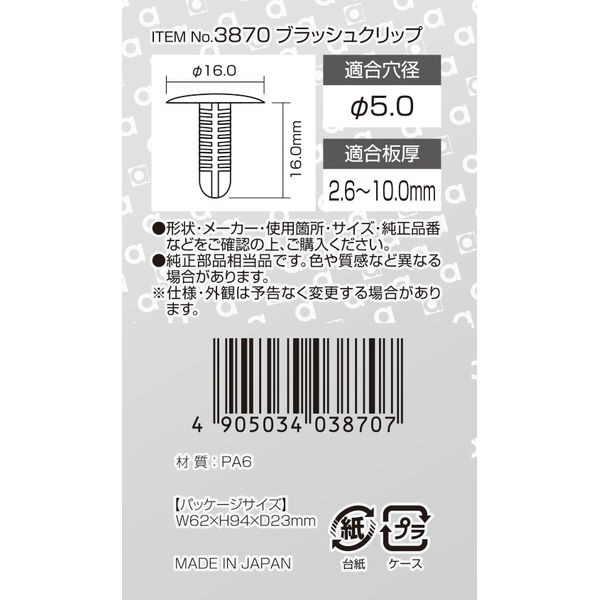 | 商品名 | 3870 ブラッシュクリップ (トヨタ・ホンダ車用) トリムボード用/5個入り 3870 |