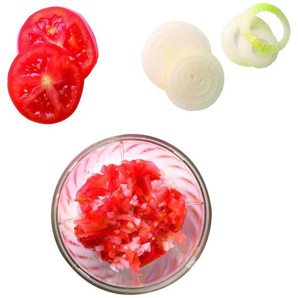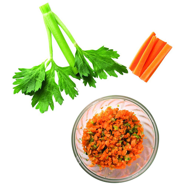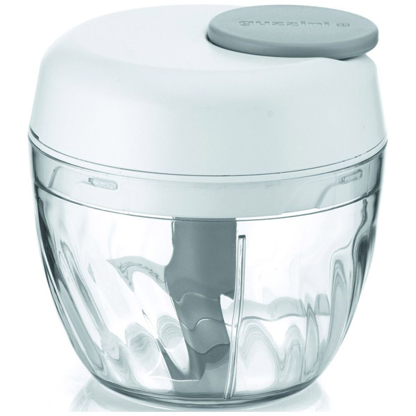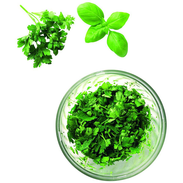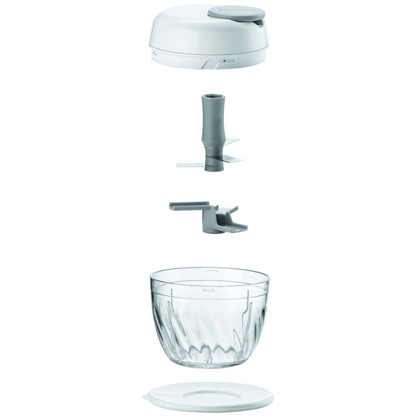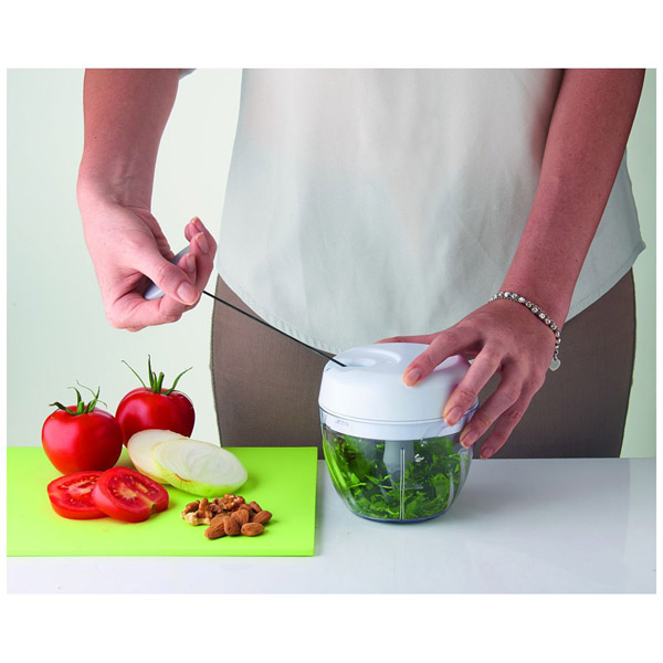 ハンドルを引くだけでカッターが高速回転して簡単にみじん切りできる。細目から粗目までは回転数で調整できる。野菜、ハーブ、ドライフルーツなど。電源不要なのでいつでもどこでもすぐに使える。