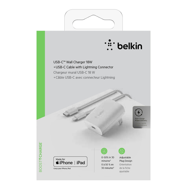 【PD対応】BOOST↑CHARGE USB充電器(18W USB-C、USB-C to ライトニングケーブル付き) ホワイト F7U096DQ04WHT [USB Power Delivery対応 /1ポート]