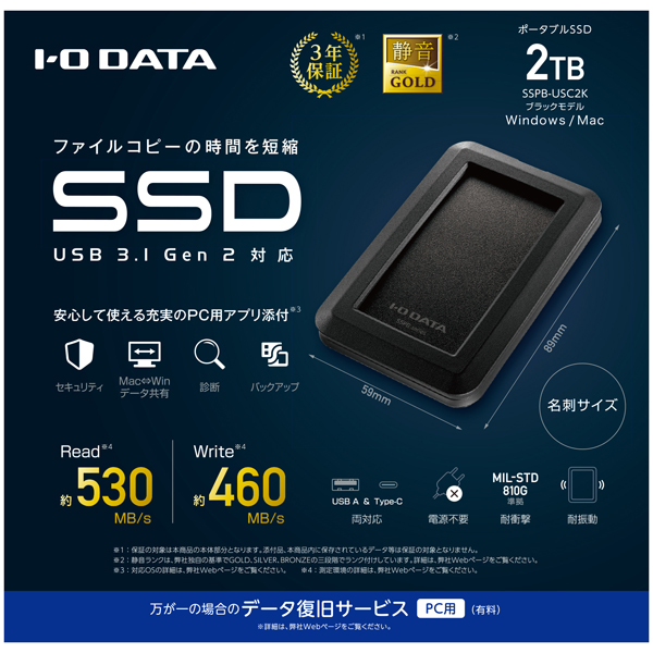 SSPB-USC2K 外付けSSD USB-C+USB-A接続 法人向け ブラック [2TB /ポータブル型]