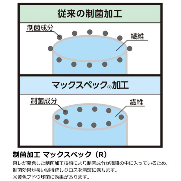 東レが開発した制菌加工技術により制菌成分が繊維の中に入っているため、制菌効果が長い間持続しクロスを清潔に保ちます。※黄色ブドウ球菌に効果があります。