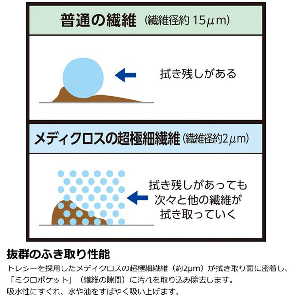 トレシーを採用したメディクロスの超極細繊維(約2μm)が拭き取り面に密着し、「ミクロポケット」(繊維の隙間)に汚れを取り込み除去します。吸水性にすぐれ、水や油をすばやく吸い上げます。