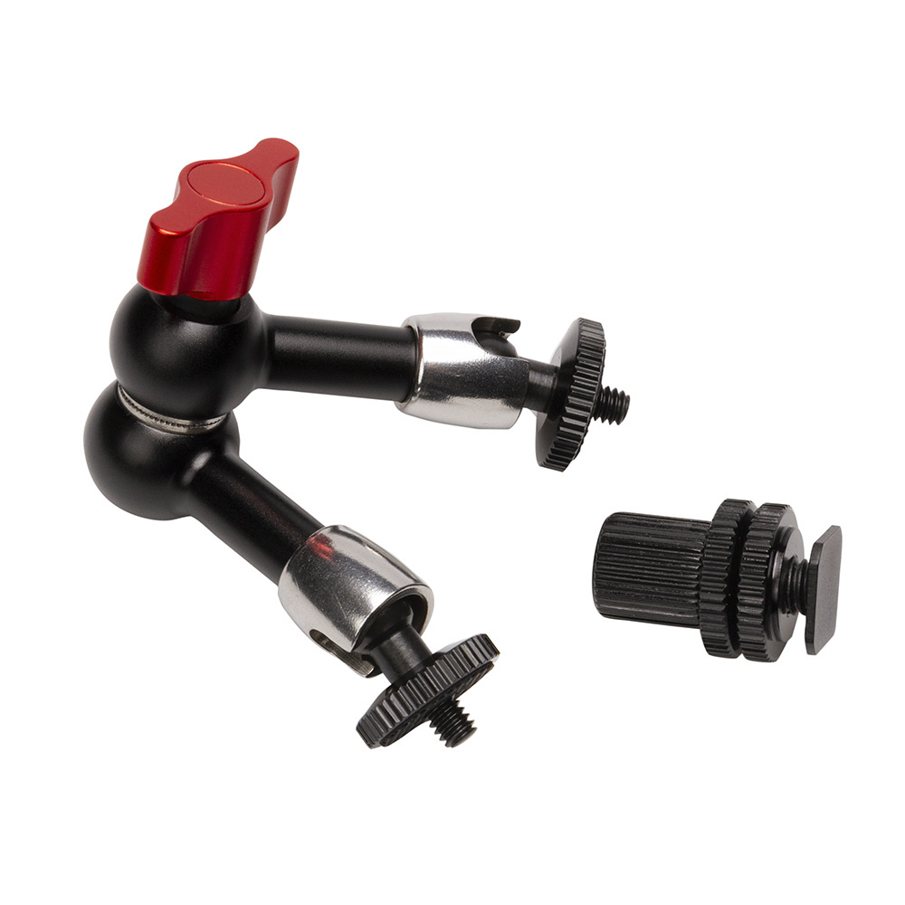 1カ所のノブ操作でアーム全体の固定と自由なセッティングが可能です。両端には1/4ネジが装備されているほか、シューアダプターを付属しています。