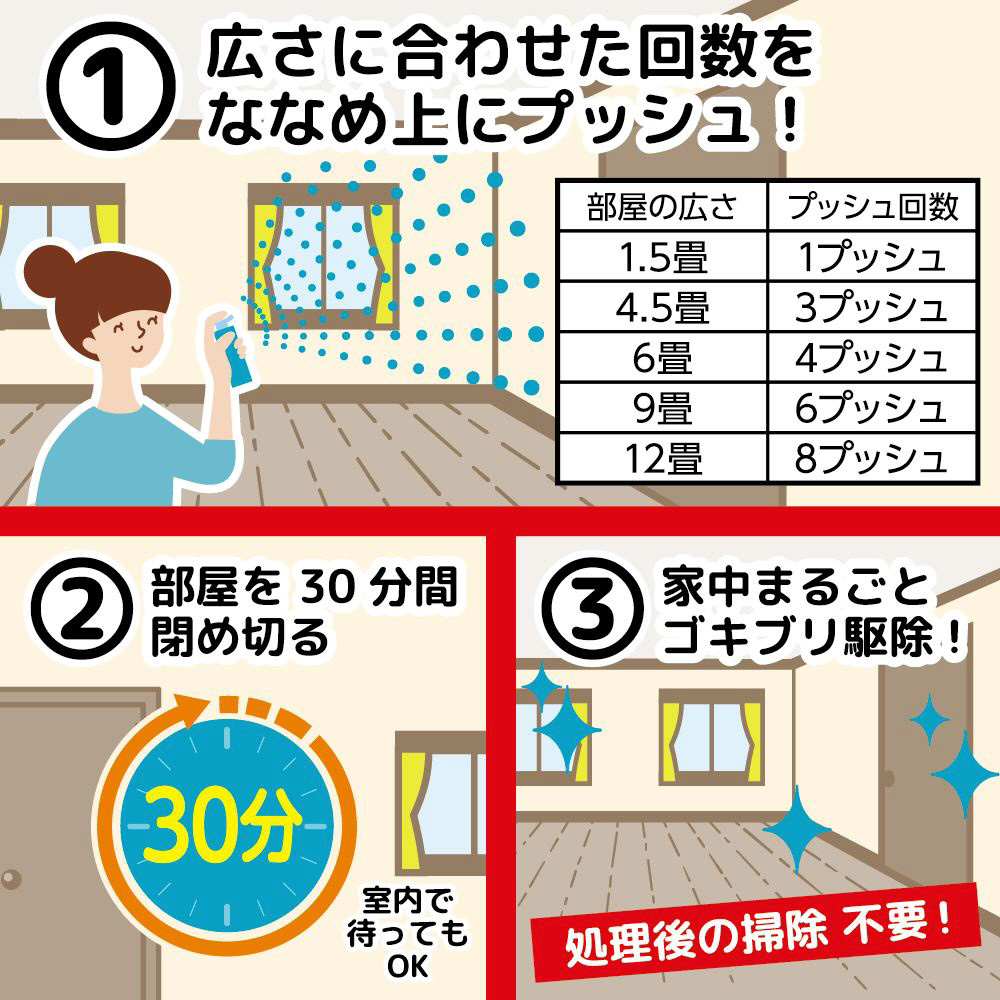 30分間お部屋を閉め切るだけで、ミクロの殺虫成分がお部屋のスミズミまでいきわたり、スキマに隠れたゴキブリも追い出し、駆除します