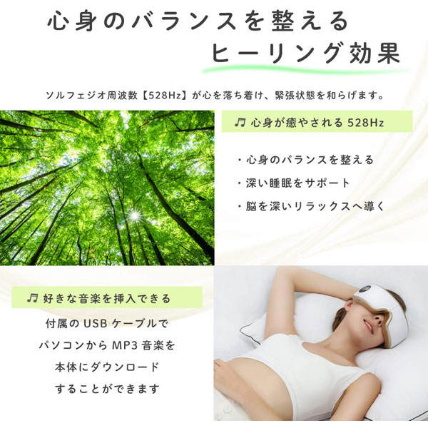 厳選したヒーリングで、まるで自然に包まれているような体験をお届けします。 BGMを4曲内蔵しているので、開封後すぐにマッサージと音楽を楽しめます。さらに付属のUSBコードでパソコンと本製品を接続すると、お好きなMP3音楽を新しくダウンロードして曲の追加も可能です。