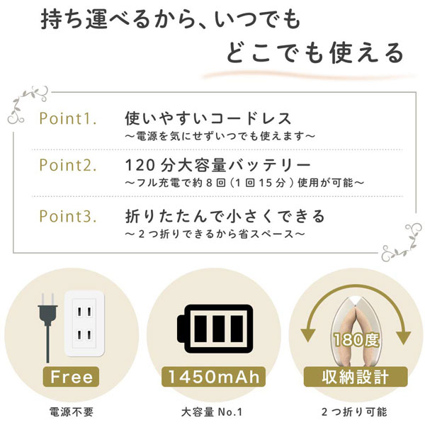 持ち運べるから、いつでもどこでも使える!連続120分使用可能。外出や出張でも充電長持ち!