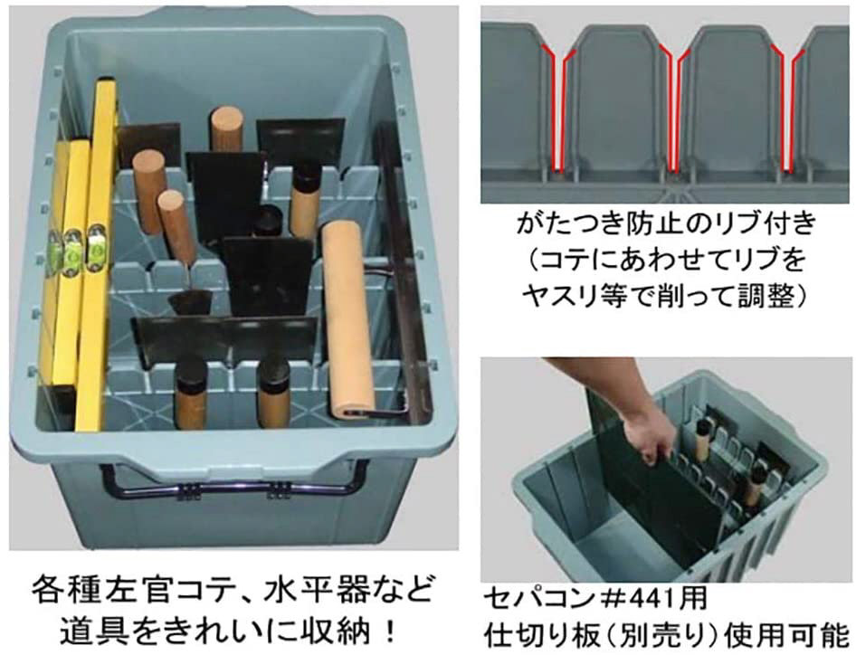 左官こて用仕切板の使用で、スッキリきれいに収納。