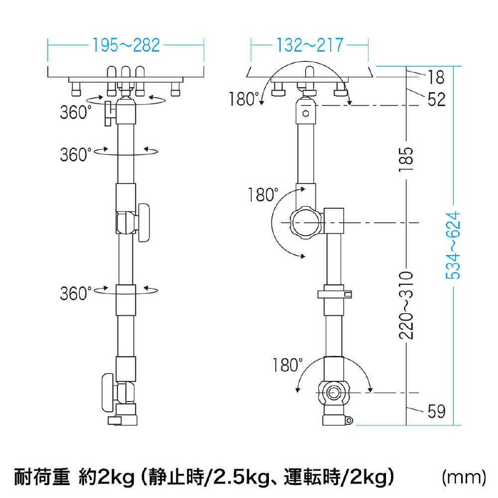 | 仕様2 | サイズ:全長/W195〜282×D132〜217×H534〜624mm 重量:約1252g 耐荷重:約2kg ※静止時/2.5kg、運転時/2kg 材質:ホルダー/ABS樹脂、アーム部/スチール 出荷形態:ノックダウン組立式 |