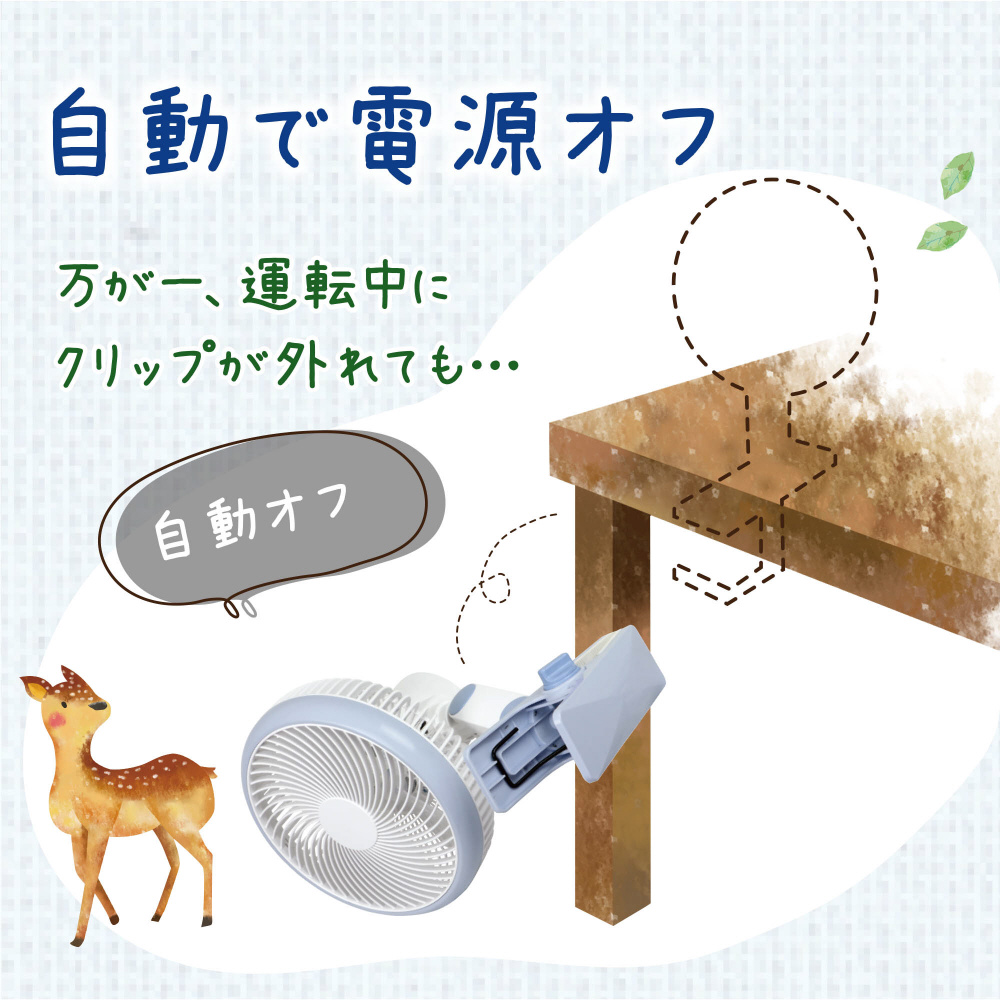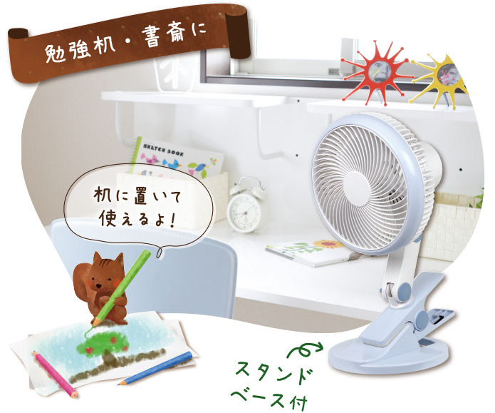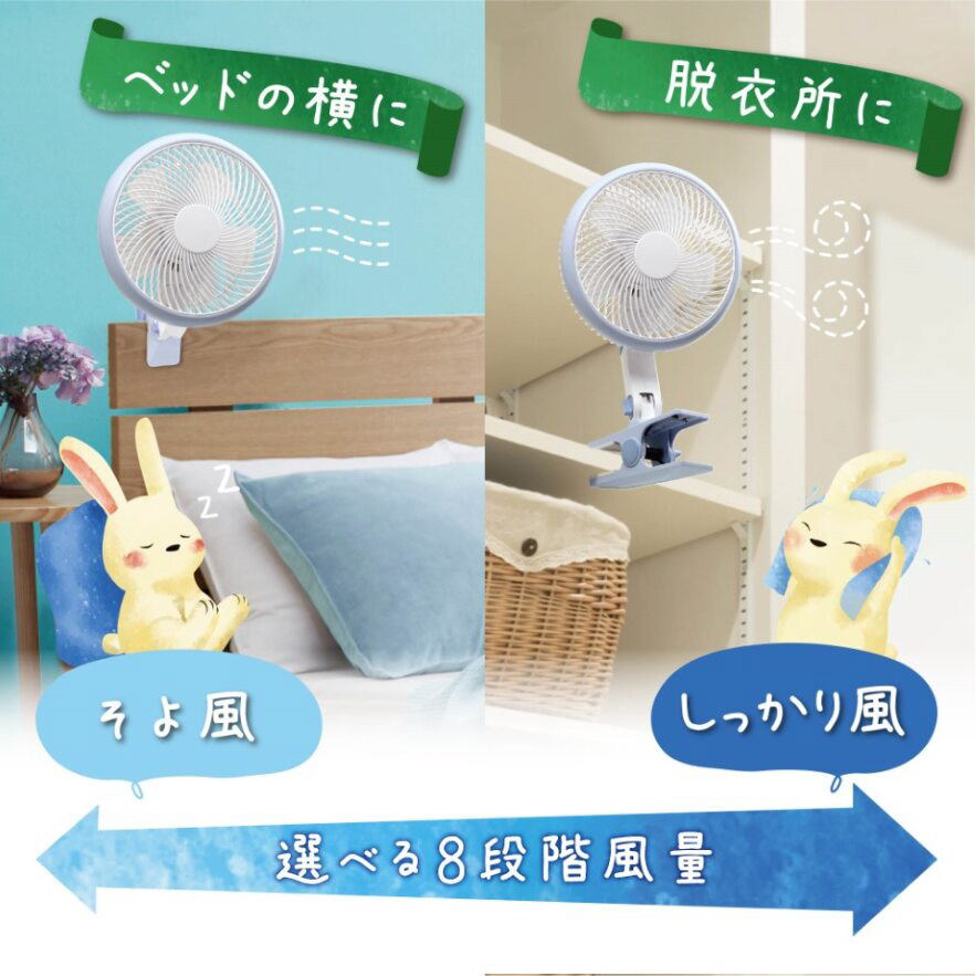 微風よりも、さらに弱い風で心地よい風を感じれるクリップ扇風機。