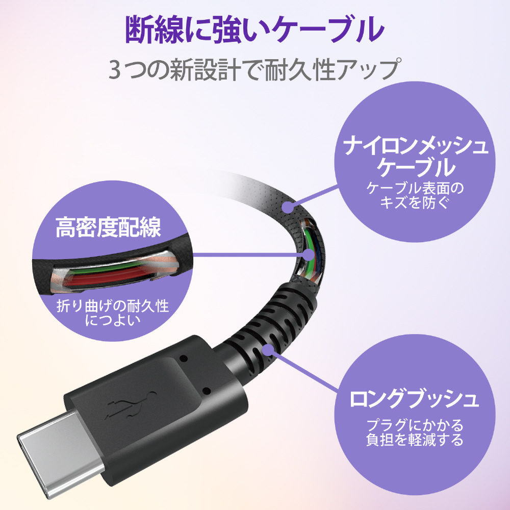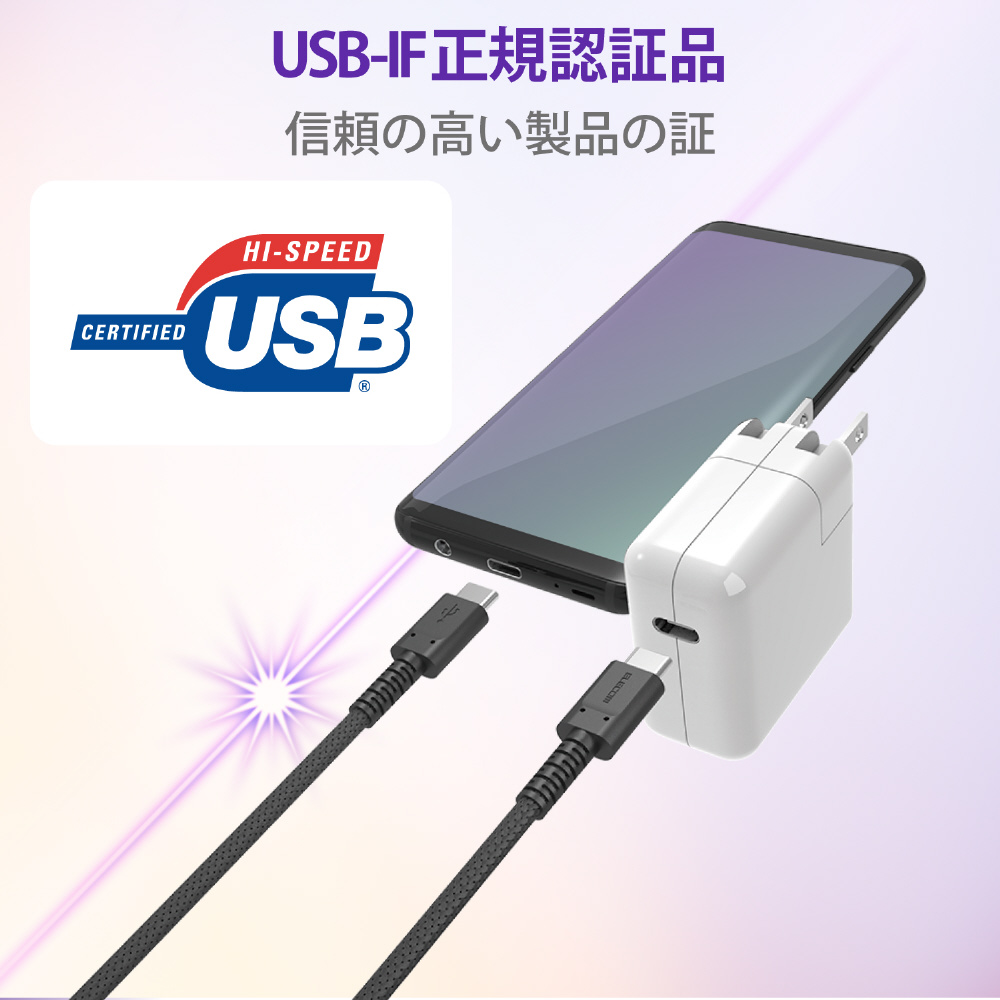 断線に強い高耐久モデル。PowerDelivery(最大60W)に対応し、スマートフォン・タブレットを超高速充電!USB Type-C端子を搭載した機器同士の接続ができるUSB2.0ケーブル。