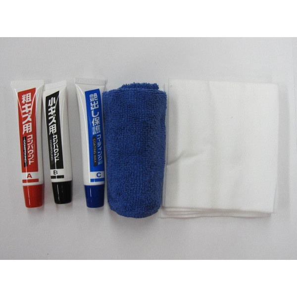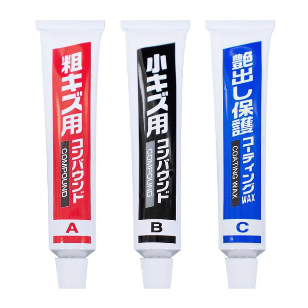 「粗キズ用コンパウンド」「小キズ用コンパウンド」「艶出し保護用コーティングWAX」と、キズの状態に応じて使い分けができる本格的な3本セット。
