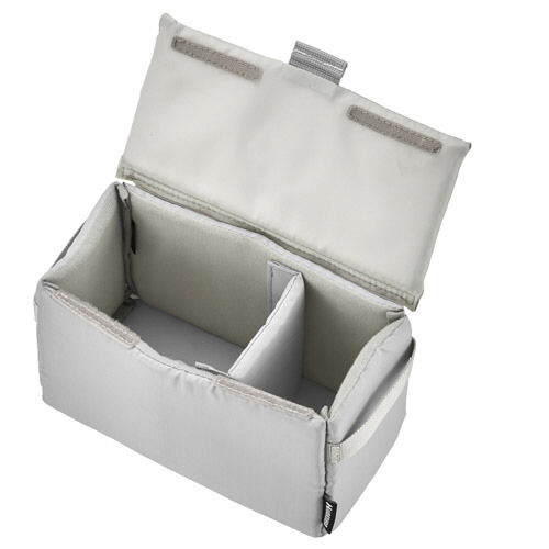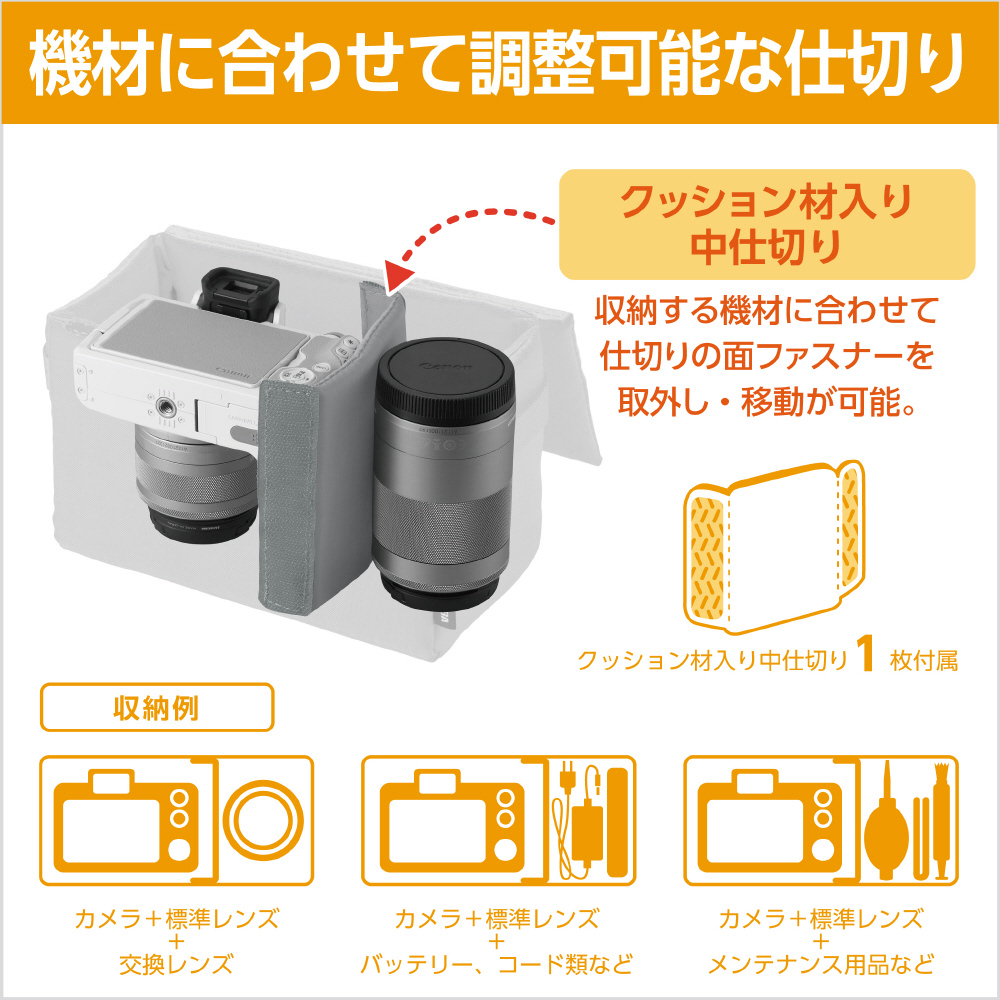 そのまま入れるだけでいつものバッグがカメラバッグに早変わり。全面の厚いクッションが機材をしっかり保護します。