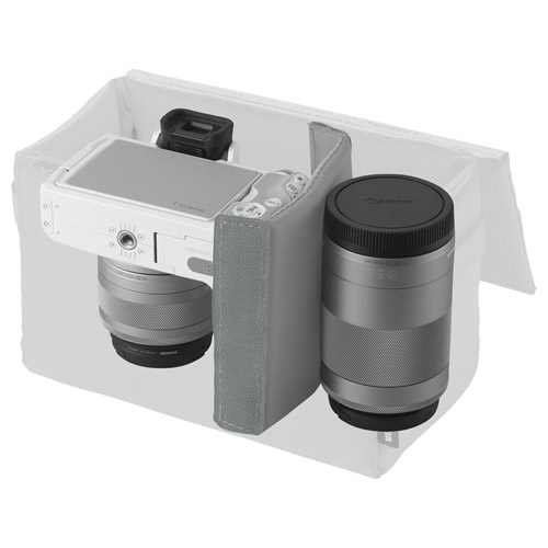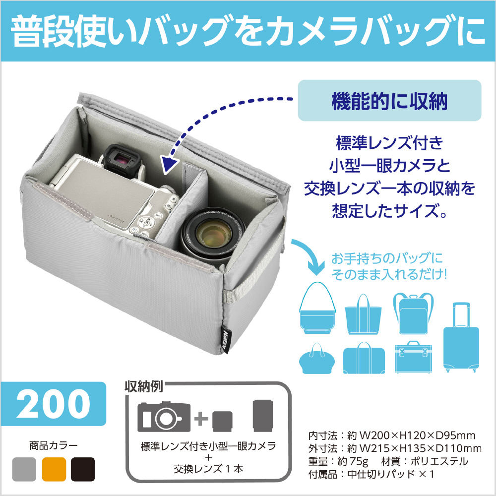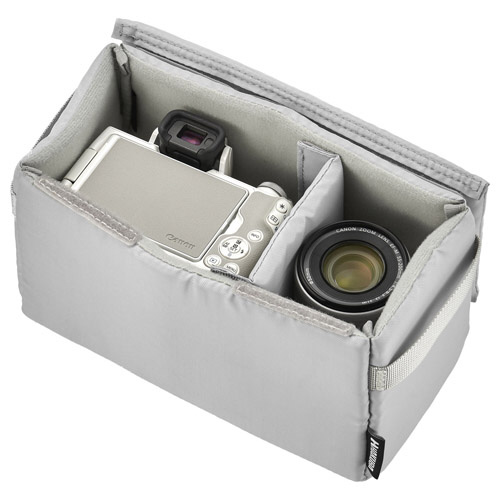 普段使いのバッグがカメラバッグに早変わり!標準レンズ付き小型一眼カメラと交換レンズ一本の収納を想定したサイズです。
