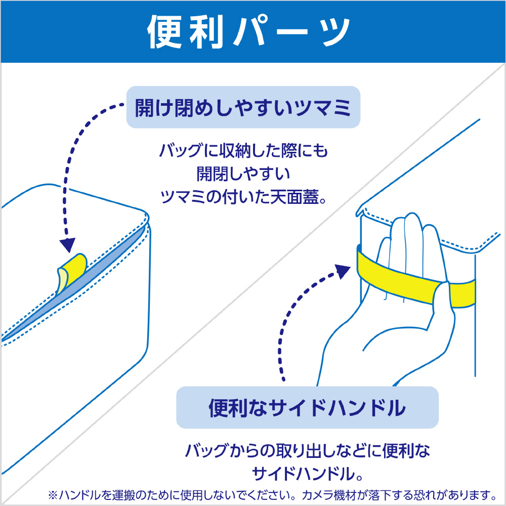 バッグからの取り出しなどに便利なサイドハンドル。※ハンドルを運搬のために使用しないでください。カメラ機材が落下する恐れがあります。