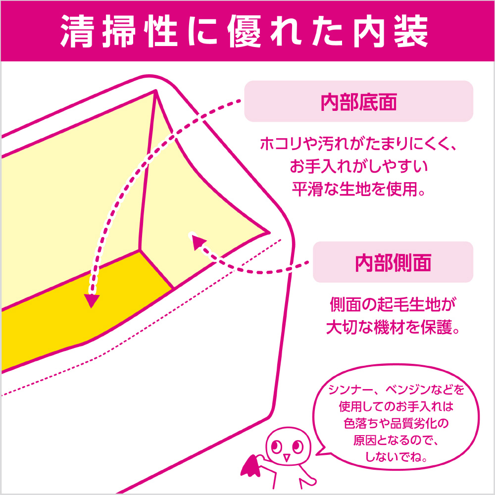 内部側面には機材にやさしい起毛生地、内部底面には、ホコリや汚れがたまりにくく、お手入れがしやすい平滑な生地を使用