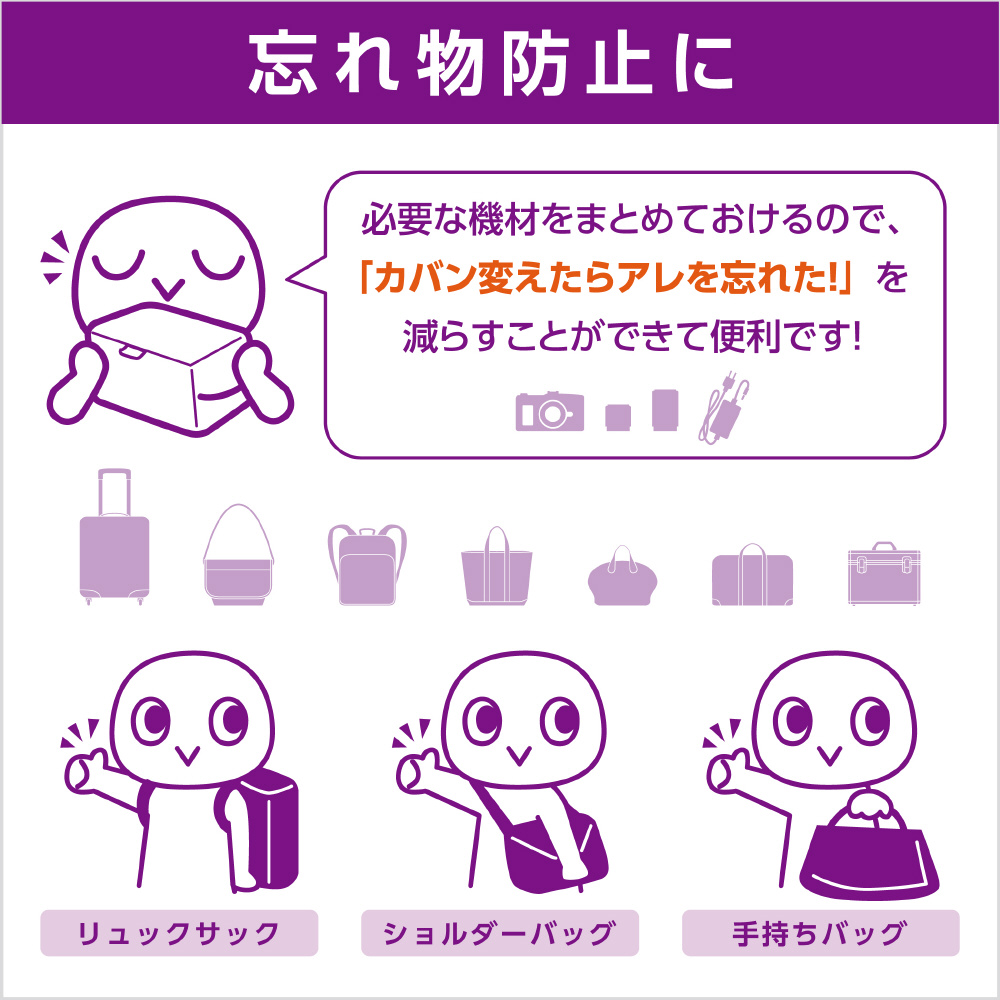 クッション入りのフタはホコリの侵入や上からの衝撃から守り、不要な時は取り外しが可能です。機材やバッグに合わせて選べる4サイズ展開。