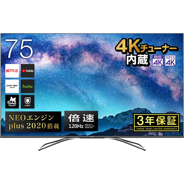 75インチULED BS/CS 4Kチューナー内蔵・レグザエンジン NEOplus 2020搭載モデル。「AIが描き出す高画質、LIVE感あふれる高音質」