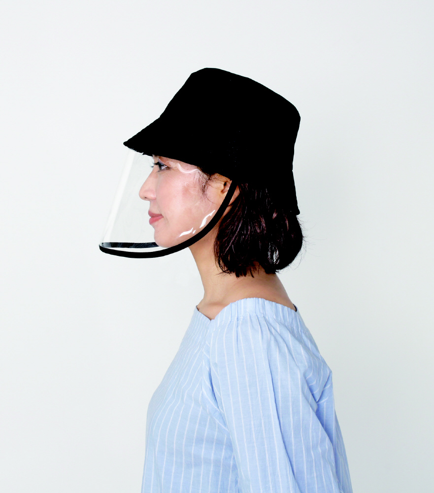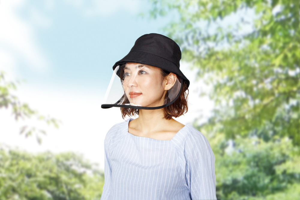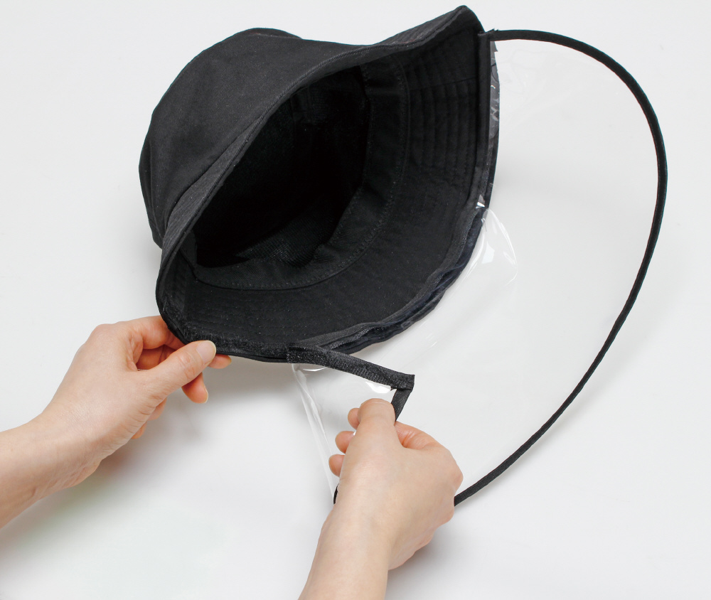 帽子+透明カバーで飛沫対策&紫外線対策。