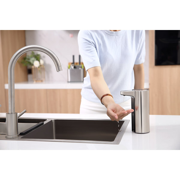手を触れることなくセンサーに手を近づけるとソープが自動的に出てきます。ご使用になるソープは3段階に調節できる、衛生的なソープディスペンサーです。