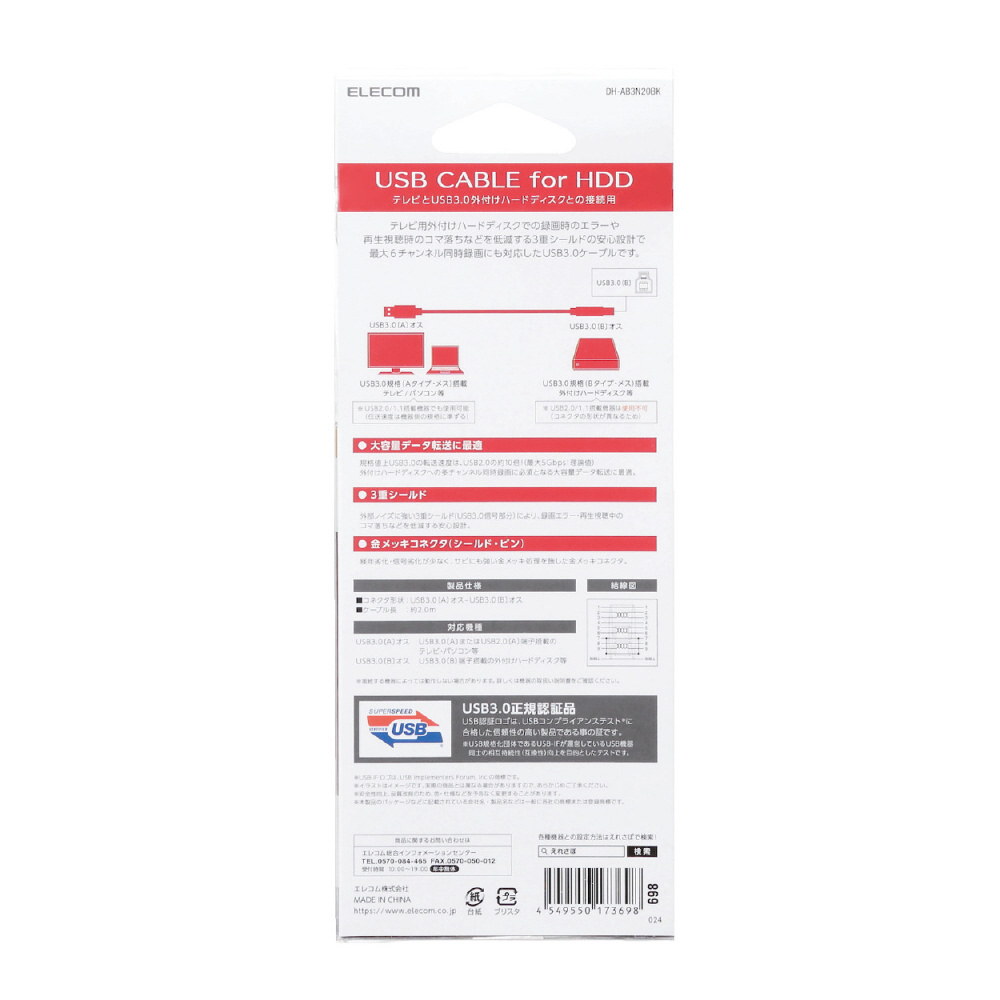 | 商品名 | USB3.0ケーブル A-Bタイプ AV売場用 2.0m ブラック DH-AB3N20BK |